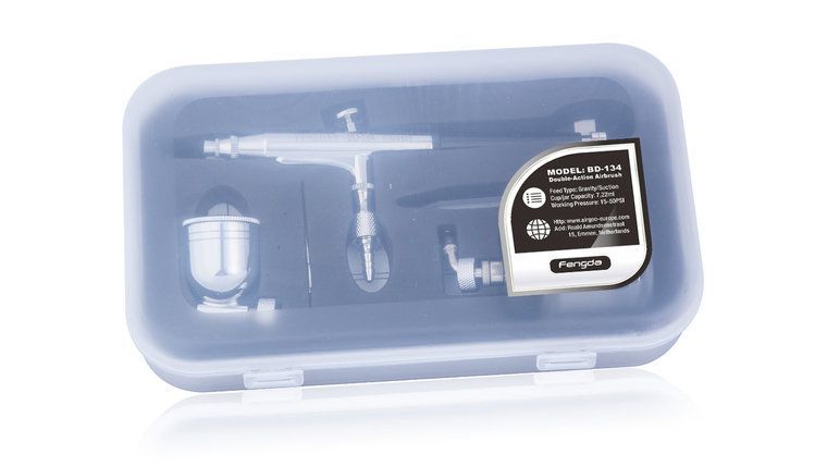 Airbrush pistool BD-134 wordt geleverd in een handige plastic doos met doorzichtig kantelbare deksel.