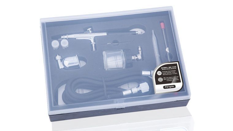 Super mooie double action airbrushkit FE-134K, geleverd in mooie gevormde kunstof doos met een uitgebreid asortiment aan accessoires. Dankzij de vele meegeleverde accessoires is het instrument multifunctioneel bruikbaar.